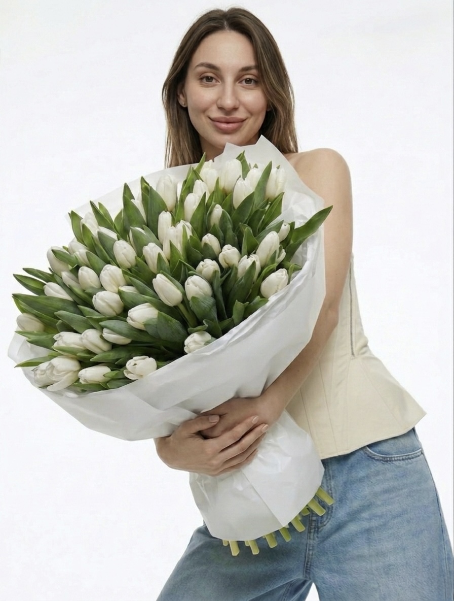 Monumentalny mono-bukiet z białych tulipanów — symbol czystości i nowoczesnej elegancji. Perfekcyjna geometria i gęsta kompozycja podkreślają siłę ukrytą w prostocie. Dla osób, które postrzegają minimalizm jako najwyższą formę luksusu.