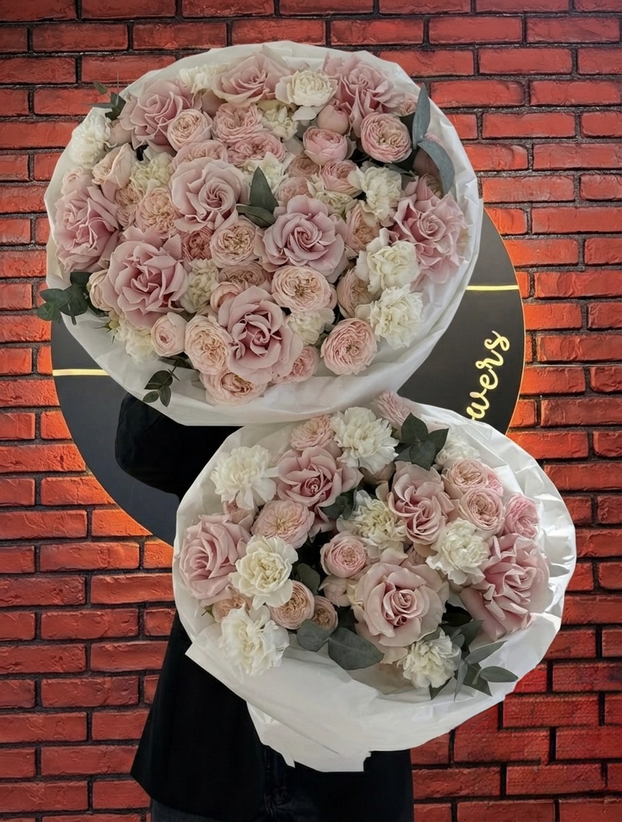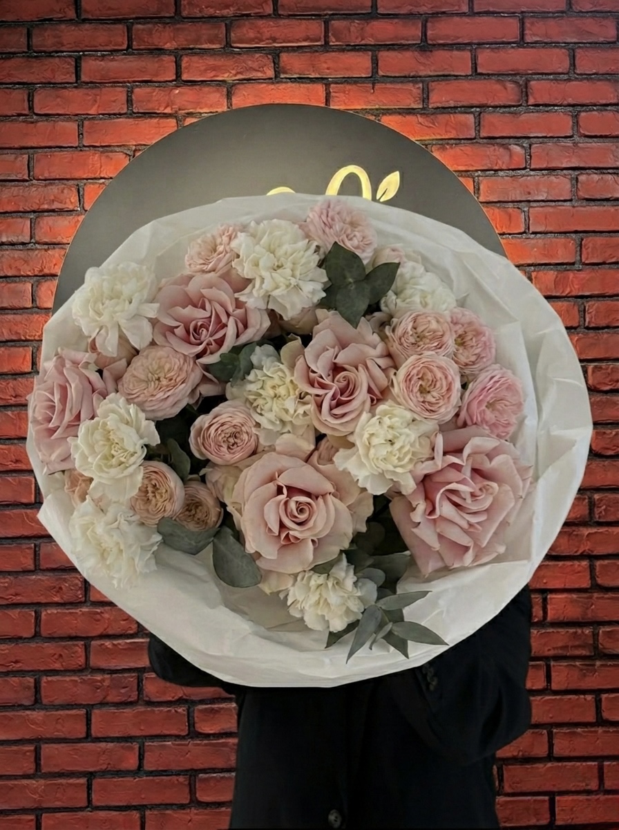 Delikatny bukiet w pudrowych odcieniach, w którym róże w kolorze blush harmonijnie łączą się z kremowymi akcentami i subtelną zielenią eukaliptusa. Lekki, elegancki i ciepły — jak czułe objęcie o świcie. Idealny na szczere wyznania, wyjątkowe chwile i uczucia, których nie trzeba wypowiadać na głos.