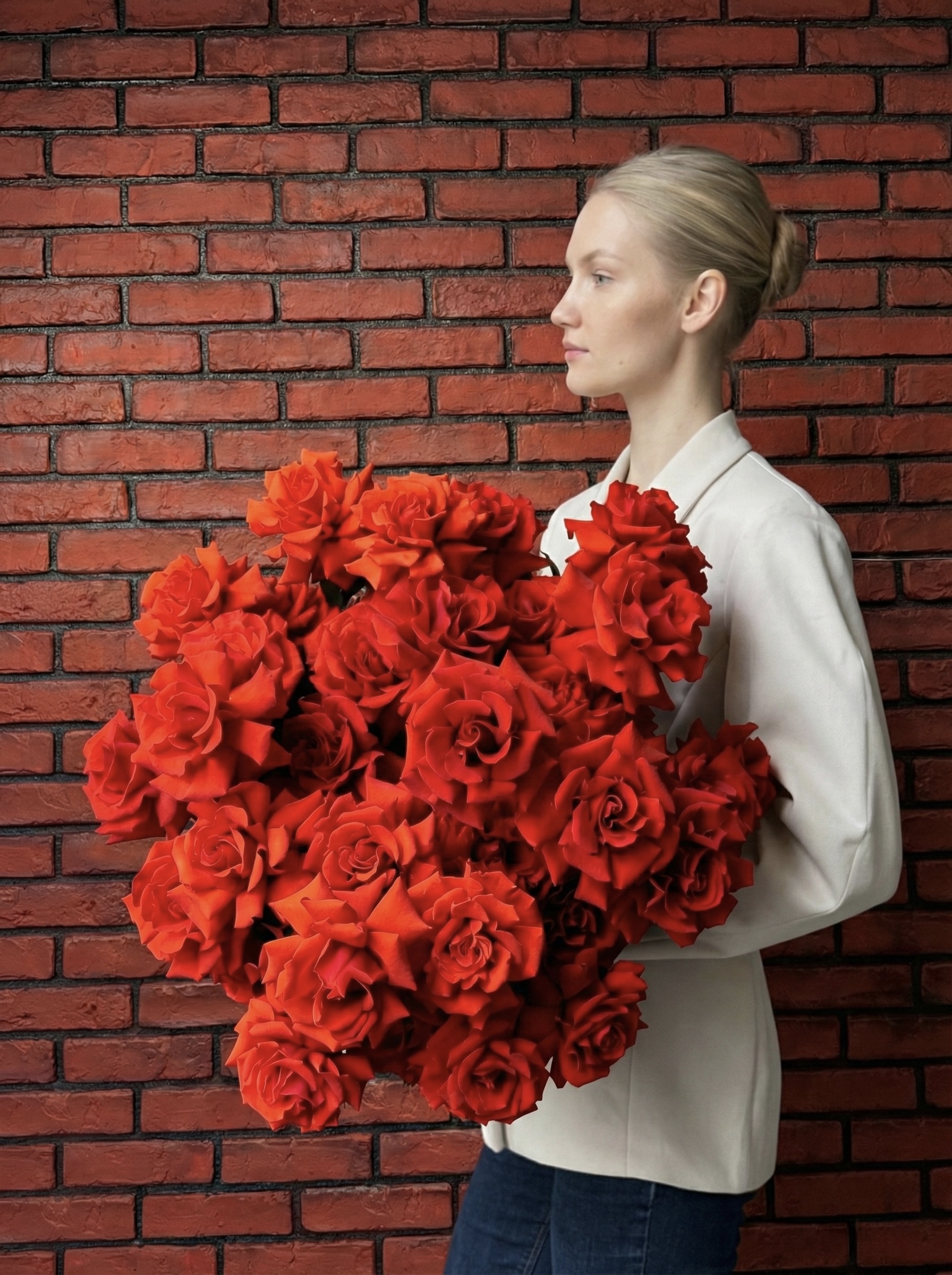 Ten bukiet przypomina dotyk, od którego zapiera dech w piersiach. Głęboka czerwień róż symbolizuje pasję, pożądanie i siłę uczuć, które nie wymagają słów. Stworzony dla odważnych wyznań, intensywnych emocji i chwil, które pozostają w pamięci.