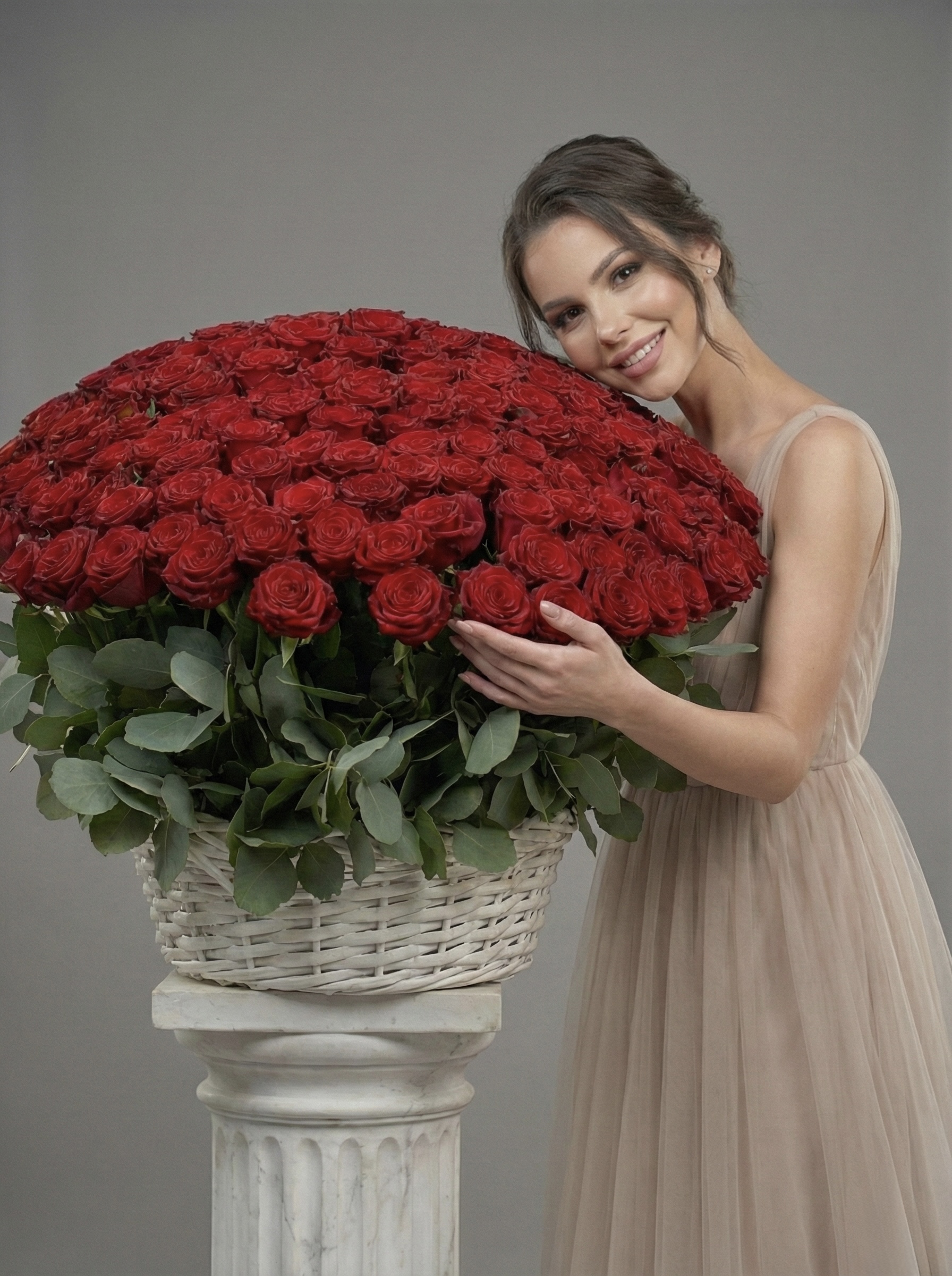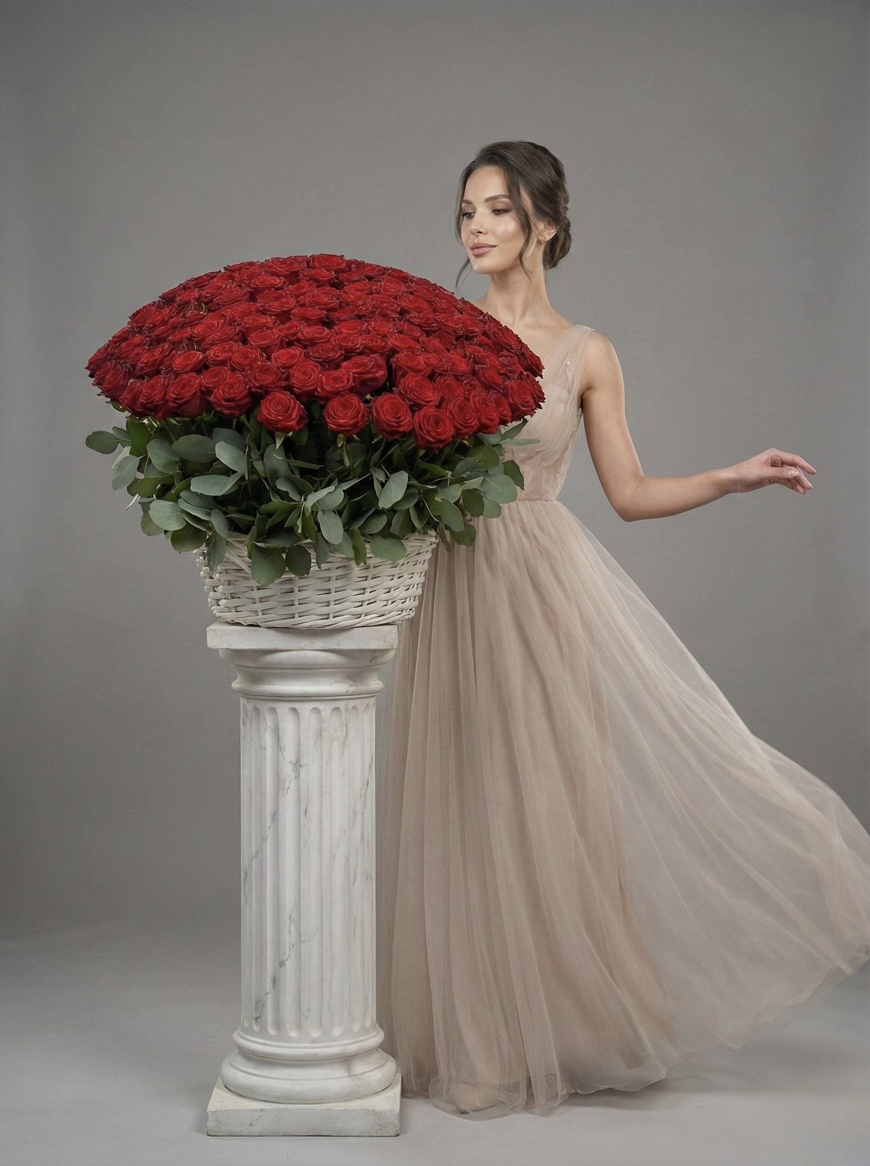 Kompozycja, w której emocja staje się sztuką. Luksusowe szkarłatne róże, ułożone w doskonałej formie, ucieleśniają siłę miłości, głębię pasji oraz piękno szczerego przeżycia. Szlachetna zieleń podkreśla intensywność barwy, budując poczucie uroczystości, harmonii i wyrafinowanej elegancji.